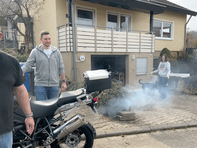 Neben dem neuen Domizil werden auch die neuen Bikes vorgestellt. Man beachte die Qualmwolken bei Christians "neuer" GS (SCHMUNZEL)!